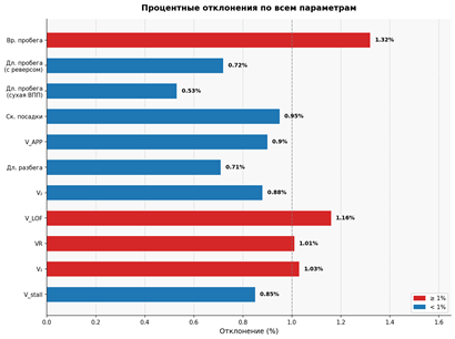 • Отклонение по длине разбега (5 м / 0,71%): обусловлено незначительным расхождением между упрощённой моделью трения, применяемой в программе (