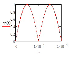 В качестве примера сигнала был рассмотрен вариант двухполупериодного выпрямления гармонического колебания. На рис. 1 представлены графики временной функции и амплитудного спектра этого сигнала: