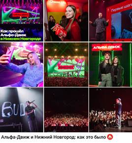 Если оценивать различные публикации, связанные с этим мероприятием, то посты об Альфа-Движе были размещены в Телеграм канале проекта Alfa Students от Альфа-Банка, его мы уже упоминали выше. Было опубликовано 3 поста: пост-анонс, пост с расписанием предстоящего мероприятия и рассказ об уже прошедшем ивенте. В среднем эти посты набрали по 12 тыс просмотров на каждый, что является неплохим показателем для канала с чуть больше 32 тысячами подписчиков.