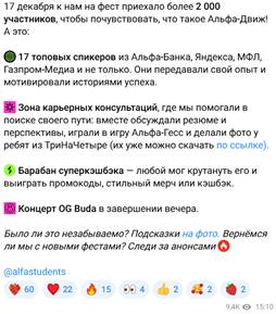 Исходя из проведенного анализа в Таблице 1 можно сделать вывод, что мероприятие является эффективным для двух сторон, как для компании, так и для участников. К тому же, оно является двухэтапным и содержит в себе как онлайн, так и оффлайн часть. Теперь проанализируем эффективность через медиа присутствие. Официальная новость об данном мероприятии в Телеграм аккаунте Альфа-Банка, опубликованная 28 августа 2024 года, набрала 1,3 миллиона просмотров, что приблизительно на 30% больше, чем количество подписчиков данного канала (998 119 человек по состоянию на 03.04.2025), также получила более 1,5 тысячи реакций. Также новость о данном мероприятии, а точнее о его итогах, разместил в своем сообществе ВКонтакте проект от Альфа-Банка Alfa Students.