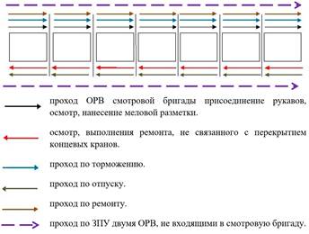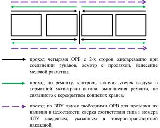 Проверка ЗПУ производится путем прохождения вдоль состава, с 2-х сторон одновременно. При этом время на проверку ЗПУ не может превышать норматив времени на техническое обслуживание. Схемы проходов ОРВ при проверке ЗПУ в зависимости от технологии технического обслуживания изображены на рисунках 1 и 2.