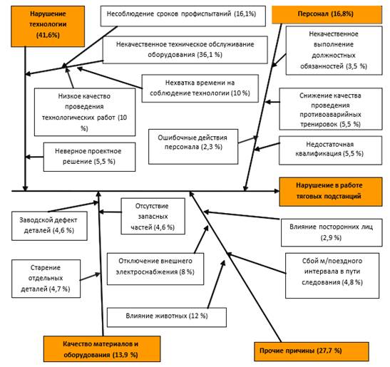 Из анализа диаграммы причинно - следственных связей видно, что основной причиной допущенных нарушений является некачественное техническое обслуживание оборудования тяговых подстанций.