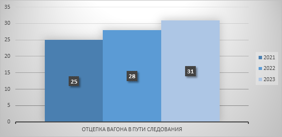 Технический осмотр грузовых вагонов необходим для надежной эксплуатации подвижного состава. Ошибки в осмотрах влекут за собой поломки в пути следования и отцепки вагонов от состава из-за технической неисправности. Рассмотрим статистику отцепок вагонов в пути следования на рисунке 1.