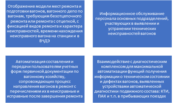 С каждым годом случаи учащаются, но и рост числа вагонов увеличивается. При техническом обслуживании осматривается тормозное оборудование, автосцепное устройство, колесные пары вагона, а также кузов вагона. Автоматизация процесса осмотра вагонов значительно упрощает работу осмотрщиков, а также исключает человеческий фактор в случае неправильного технического обслуживания. Существует специальная автоматизированная система управления пункта технического обслуживания вагонов (АСУ ПТО) предназначена для информационного обеспечения и оформления результатов выполнения технологических процессов обслуживания грузовых поездов и вагонов на пунктах технического обслуживания эксплуатационных вагонных депо и местах ремонта. Рассмотрим функции на рисунке 2.