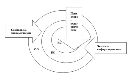 В настоящее время под безопасной средой большинством ученых понимается состояние комфортности и защищенности обучающихся в образовательной организации от реальных угроз и вероятных рисков (социального, техногенного, природного характера), необходимое для ее оптимального функционирования и развития. В частности, И.Б. Бичева, проводя анализ содержания категории «безопасность образовательной среды», выделила две группы факторов: внутренние (социально-экономические и эколого-информационные) и внешние (психолого-педагогические). Учет их влияния на реализацию образовательного процесса, по мнению исследователя, определяет содержание и вектор научной-исследовательской деятельности педагогического коллектива по проектированию безопасной среды в общеобразовательной организации [2, с.11]. Схематически взаимосвязь указанных групп факторов в формировании безопасной и психологически комфортной среды образовательной организации можно представить на рисунке 1.