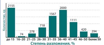 Максимальное количество месторождений относится к малоразложившейся категории торфа (до 15 %) — 25 % фонда, которые сосредоточены в основном в Витебской области. Встречаются такие месторождения и в Гомельской и Минской областях. Значительная доля приходится на диапазон 36–40 % (23,2 %). Характер распределения показателя степени разложения, если не учитывать диапазон до 15 %, выявляет нормальный закон, характеризуемый малыми долями низких и высоких значений, хотя высоких значений (45–50 % и более) достаточно (8,3 %), (рисунок 3).