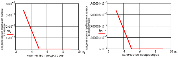 Рисунок 5. Графики зависимости среднего времени ожидания заявки в очереди, среднего времени пребывания заявки в обработчике от количества процессоров МП СМО без ограничений на очередь
