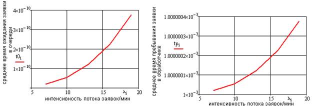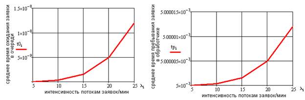 Рисунок 3. Графики зависимости среднего времени ожидания заявки в очереди, среднего времени пребывания заявки в обработчике от интенсивности заявок МП СМО без ограничений на очередь
