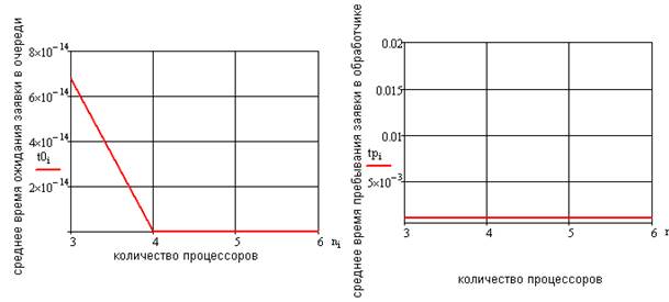 Рисунок 4. Графики зависимости среднего времени ожидания заявки в очереди, среднего времени пребывания заявки в обработчике от количества процессоров МП СМО с ограниченным числом мест в очереди