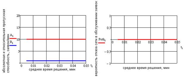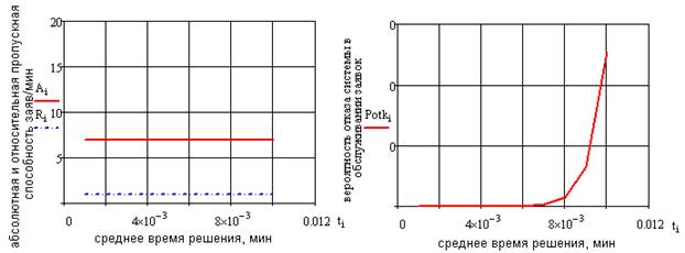 Рисунок 7. Графики зависимостей абсолютной, относительной пропускной способности и вероятности отказа системы в обслуживании от среднего времени решения МП СМО без ограничений на очередь