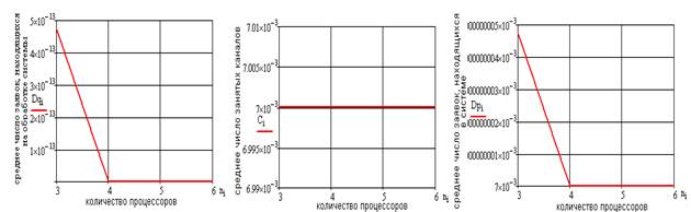 Рисунок 8. Графики зависимостей среднего числа занятых каналов, среднего числа заявок, среднего числа информации, находящейся в системе от количества процессоров МП СМО с ограниченным числом мест в очереди