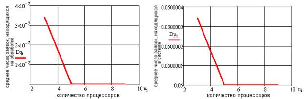 Рисунок 9. Графики зависимостей среднего числа заявок, находящихся на обработке системы, и среднего числа заявок, находящихся в системе от количества процессоров МП СМО без ограничений на очередь