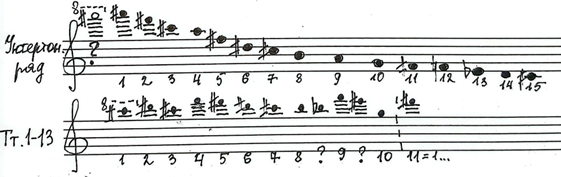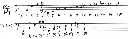 Рисунок 1 Шкала обертонов (верхняя строка) в сопоставлении с «обертоновым» пластом (партия левой руки, схема)