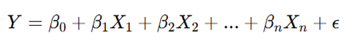 Многофакторная линейная регрессия описывает зависимость целевой переменной Y (цену биткоина) от множества независимых переменных X1,X2,...,Xn по формуле: