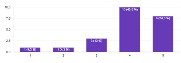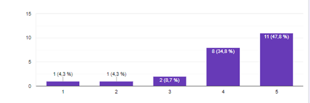 Второй вопрос касался оценки уровня самостоятельности студентов. Ответы распределились следующим образом: 4,3% поставили 1 балл, 4,3% – 2 балла, 13% – 3 балла, 43,5% – 4 балла и 34,8% – 5 баллов. В результате 78,3% студентов продемонстрировали высокую оценку своей самостоятельности, что является позитивным сигналом о готовности работать самостоятельно.