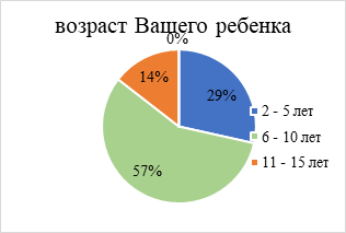 Результаты исследования: По результатам опроса количество детей с бронхиальной астмой в возрасте от 2 до 5 лет – 8 (28,5%). Количество детей в возрасте от 6 до 10 лет – 16 (57%). детей в возрасте от 11 до 15 лет – 4 (14,5%).