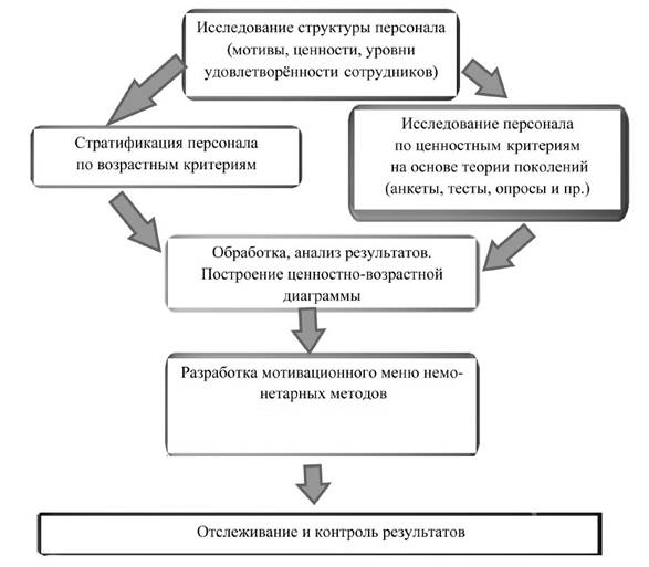 Аннотация. В статье отмечено сочетание специфических способов мотивации для нового поколения с традиционными приёмами менеджмента, рассматривается применение теории поколений, что позволит сгруппировать сотрудников в соответствии с их ценностями, навыками и мировоззрением, представлен алгоритм применения теории поколений, указаны рекомендации для сотрудников различных возрастов/