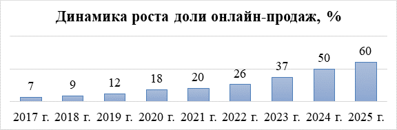 Рисунок 2. Динамика проникновения онлайн-торговли в структуру fashion-дистрибуции (2019–2025 гг.), % [1]