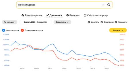 Для верификации выявленных тенденций и оценки уровня потребительского интереса был проведен анализ статистики поисковых запросов с использованием инструментария WordStat (Яндекс). Анализ динамики запросов по категории «Женская одежда» за полуторагодовой период демонстрирует общую тенденцию к снижению интереса: количество показов сократилось с 1 069 000 до 611 000 (рисунок 3). Данная динамика носит макрорегиональный характер и подтверждается выборками по Москве и Московской области (рисунок 4), что косвенно подтверждает тезис о снижении физических объемов спроса.