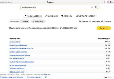 Как видно из рисунка 4, доминирование запросов «магазин женской одежды» и «интернет-магазин женской одежды» свидетельствует о направленности пользователей на поиск конкретных торговых площадок. Высокая доля запросов с маркерами «официальная» и «официальные сайты» подтверждает рост доверия к брендам и ориентацию на оригинальную продукцию. Присутствие запроса «2026 женская одежда» фиксирует интерес аудитории к актуальным коллекциям и трендам.